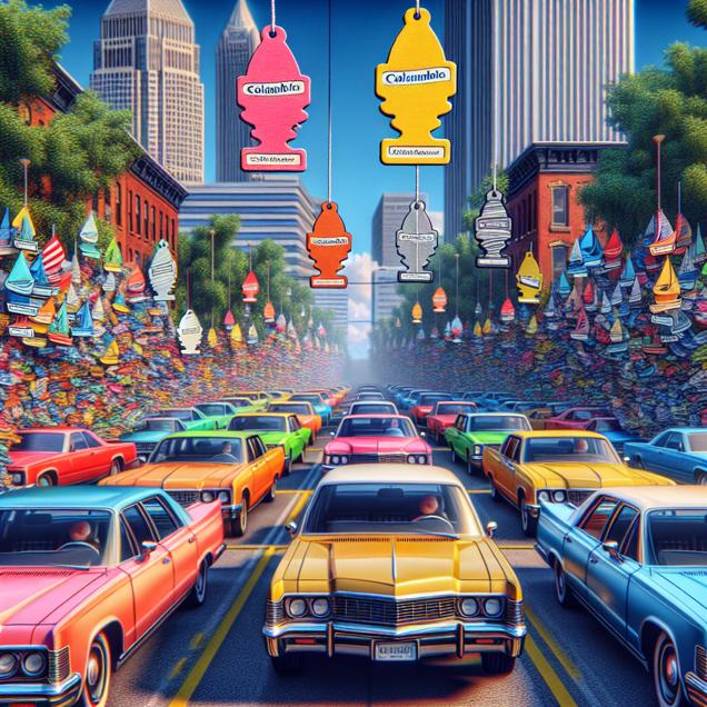 User prompt: Please respond with an image generation prompt that would be likely to create an interesting visual using DALLE-3, using the following style: [ A Discovery magazine cover image ] and depicting this scene: In Columbus, Georgia, the streets were filled with cars adorned with boat-themed air fresheners, as the popularity of the first name Nautica surged. The air was thick with a refreshing ocean scent, masking the underlying air pollution that lingered over the city. Keep the visual depiction simple. Do not include any words or speech bubbles.