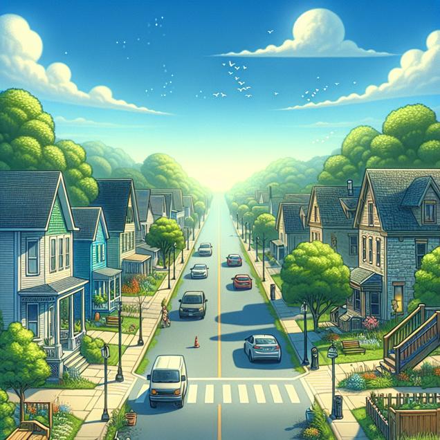 Prompt: Generate an image of an idyllic suburban street in Appleton, Wisconsin, with charming whimsical graphics. The scene should depict a decrease in traffic as fewer teachers commute to work, perhaps by showing fewer cars on the road and a clearer sky. The image should convey a sense of tranquility and a positive environmental impact, with a touch of playful fantasy. The depiction should include only scenes, people, and objects, it should not include text or speech bubbles.