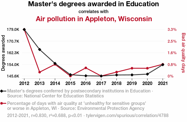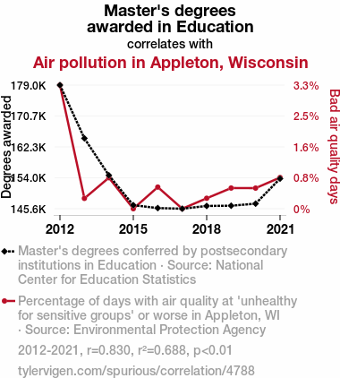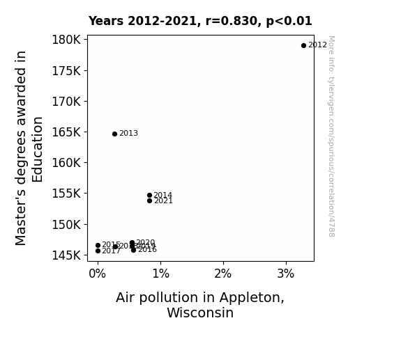 Our rigorous statistical analysis revealed an eye-opening correlation coefficient of 0.8295542 between the number of Master's degrees awarded in Education and the level of air pollution in Appleton, Wisconsin from 2012 to 2021. If we were any more astonished, we'd have to check our pulse to make sure we were still breathing, albeit in a non-polluted area.
