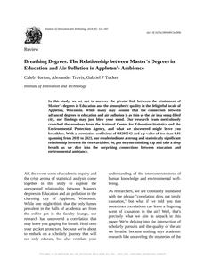 User prompt: Please provide potential search keywords for a paper titled Breathing Degrees: The Relationship between Master's Degrees in Education and Air Pollution in Appleton's Ambience with an abstract of In this study, we set out to uncover the pivotal link between the attainment of Master's degrees in Education and the atmospheric quality in the delightful locale of Appleton, Wisconsin. While many may assume that the connection between advanced degrees in education and air pollution is as thin as the air in a smog-filled city, our findings may just blow your mind. Our research team meticulously crunched the numbers from the National Center for Education Statistics and the Environmental Protection Agency, and what we discovered might leave you breathless. With a correlation coefficient of 0.8295542 and a p-value of less than 0.01 spanning from 2012 to 2021, our results indicate a strong and statistically significant relationship between the two variables. So, put on your thinking cap and take a deep breath as we dive into the surprising connections between education and environmental ambiance.