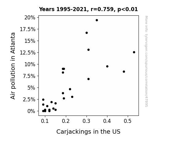 This means 57.7% of the change in the one variable (i.e., Carjackings in the US) is predictable based on the change in the other (i.e., Air pollution in Atlanta) over the 27 years from 1995 through 2021.