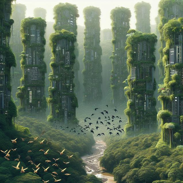ChatGPT: An image that looks like it is a scene from 'Star Wars'. Depict a dense, lush forest in the Brazilian Amazon where the tree canopies resemble towering city buildings. Disgruntled city-dwelling birds should be seen approaching the "buildings". The scene should clearly convey the confusion between natural foliage and urban structures, with an overall futuristic and otherworldly aesthetic.