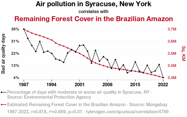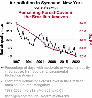This means 66.9% of the change in the one variable (i.e., Remaining Forest Cover in the Brazilian Amazon) is predictable based on the change in the other (i.e., Air pollution in Syracuse, New York) over the 36 years from 1987 through 2022.