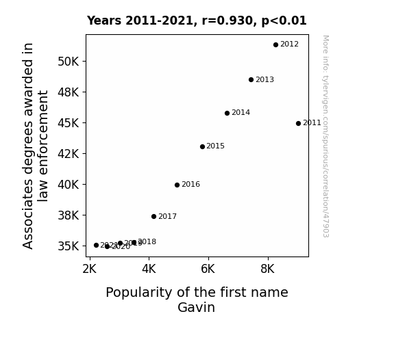 This means 86.4% of the change in the one variable (i.e., Popularity of the first name Gavin) is predictable based on the change in the other (i.e., Associates degrees awarded in law enforcement) over the 11 years from 2011 through 2021.