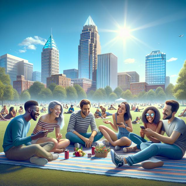 Prompt: [A photo-realistic image] Generate an image of downtown Raleigh's skyline with a park in the foreground. The park is filled with people enjoying the fresh air, sitting on blankets and engaging with their phones. The group of friends is shown laughing and chatting as they enjoy the company of one another amidst a backdrop of a clear blue sky and a smog-free city skyline in the background. The depiction should include only scenes, people, and objects, it should not include text or speech bubbles.