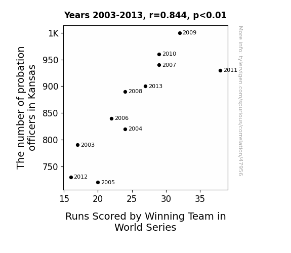 This means 71.3% of the change in the one variable (i.e., Runs Scored by Winning Team in World Series) is predictable based on the change in the other (i.e., The number of probation officers in Kansas) over the 11 years from 2003 through 2013.