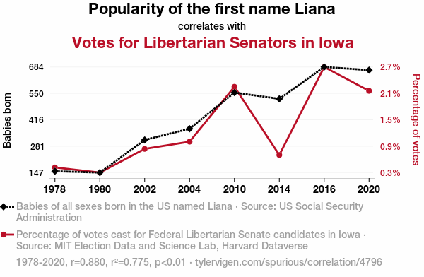 - The spurious research paper: Liana-Fide Libertarians? Correlating the Popularity of the Name Liana with Libertarian Votes for Senators in Iowa