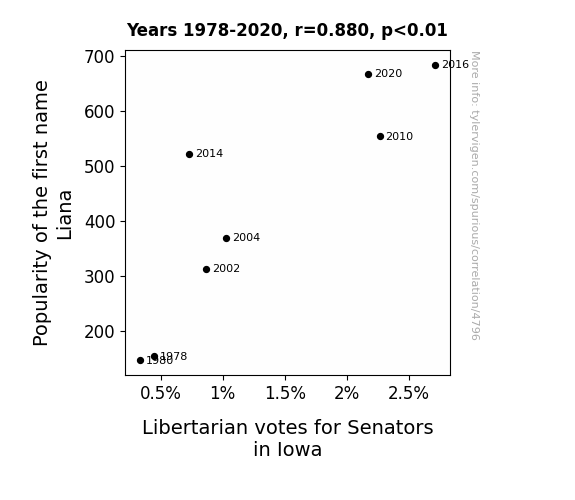 The present study investigates the peculiar relationship between the popularity of the first name Liana and the tendency of voters to support Libertarian candidates in senatorial elections in the state of Iowa. Drawing from comprehensive datasets provided by the US Social Security Administration and the MIT Election Data and Science Lab, Harvard Dataverse, we conducted a rigorous statistical analysis spanning the years 1978 to 2020. Our findings reveal a strikingly high correlation coefficient of 0.8803237 (p < 0.01), suggesting a strong association between the frequency of the name Liana and the propensity of Iowan voters to lean towards Libertarian candidates. The implications of our results are as intriguing as they are surprising, shedding light on a previously overlooked aspect of electoral behavior. This study not only challenges conventional notions of political demographics, but also provides ample material for name-related puns and pop culture references.