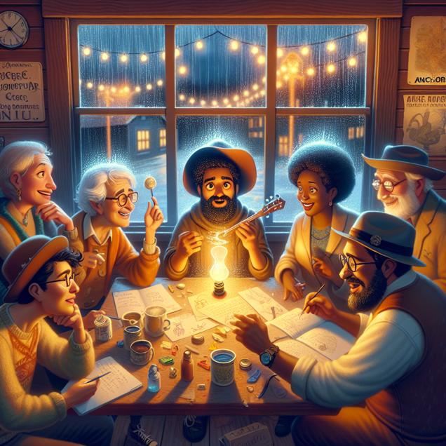Prompt: An image that looks like it is a scene from a Pixar movie, depicting a cozy, warmly lit room in Anchorage. Raindrops gently pitter-patter on the window, creating a serene ambiance. A group of writers, gathered around a table, are animatedly brainstorming ideas for OverSimplified video titles, their eyes sparkling with mischief. The rain outside seems to infuse their creative energy, inspiring them with provocative, captivating concepts. Each writer is immersed in the magic of the moment, joyfully contributing to the birth of new and compelling video titles, all while the soothing rain whispers its imaginative prompts. The depiction should include only scenes, people, and objects, it should not include text or speech bubbles.