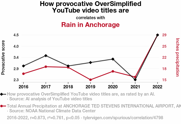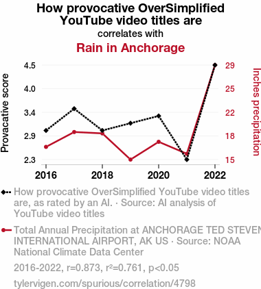Our analysis of data from 2016 to 2022 revealed a statistically significant correlation between the provocativeness of Oversimplified YouTube video titles and the occurrence of rain in Anchorage. The correlation coefficient stood at a striking 0.8725185, implying a strong positive relationship between these two seemingly unrelated variables. Additionally, the r-squared value of 0.7612886 suggests that approximately 76.13% of the variation in Anchorage's rainfall can be explained by the provocation level of YouTube video titles.