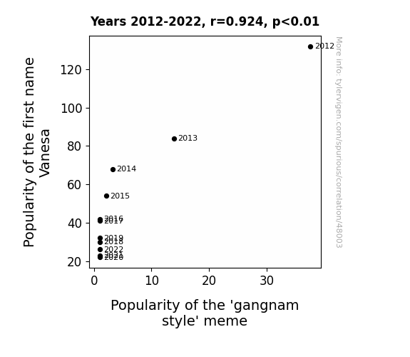 This means 85.4% of the change in the one variable (i.e., Popularity of the 'gangnam style' meme) is predictable based on the change in the other (i.e., Popularity of the first name Vanesa) over the 11 years from 2012 through 2022.