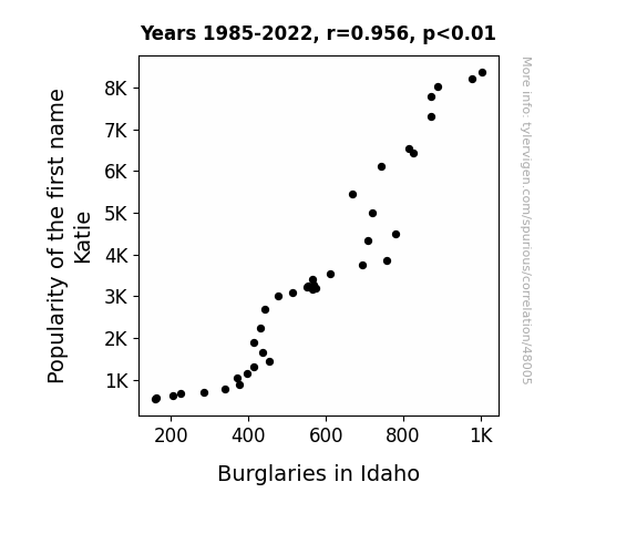 This means 91.4% of the change in the one variable (i.e., Burglaries in Idaho) is predictable based on the change in the other (i.e., Popularity of the first name Katie) over the 38 years from 1985 through 2022.