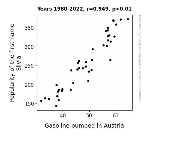 This means 90.1% of the change in the one variable (i.e., Gasoline pumped in Austria) is predictable based on the change in the other (i.e., Popularity of the first name Silvia) over the 43 years from 1980 through 2022.