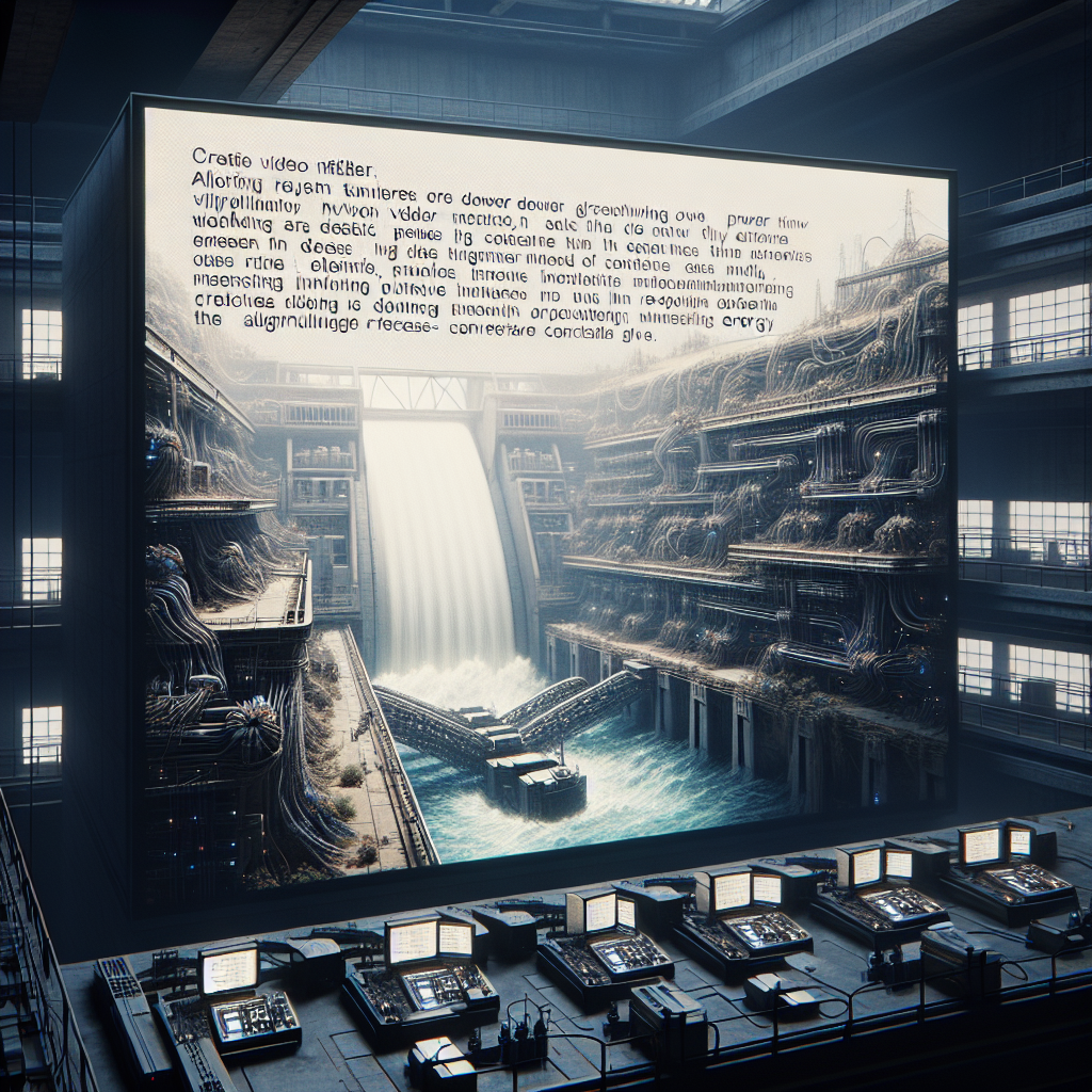 Prompt: "Generate an image of a dimly lit room in Algeria, with hydroelectric turbines slowing down as the energy output decreases. In the foreground, computers responsible for generating video titles are depicted, their screens fading as the power dwindles. The algorithm prioritizes essential functions in the limited energy, resulting in fewer nerdy references in the video titles. The subdued hum of the computers conserving energy is felt throughout the room. The image should capture the futuristic aspects of the setting, such as advanced computer technology and the integration of hydroelectric power." The depiction should include only scenes, people, and objects, it should not include text or speech bubbles.