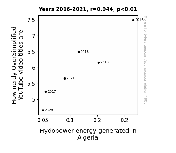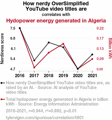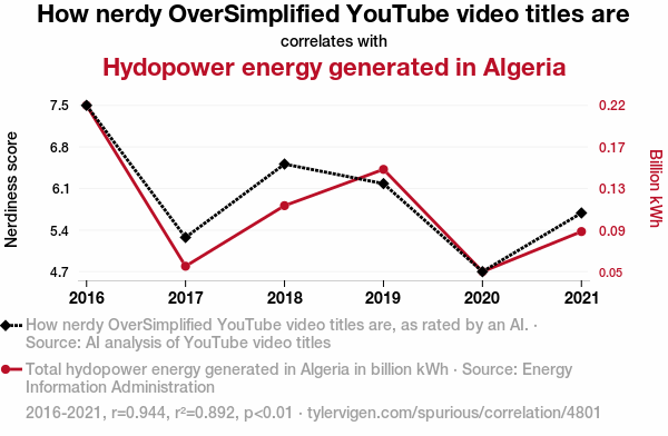 This means 89.2% of the change in the one variable (i.e., Hydopower energy generated in Algeria) is predictable based on the change in the other (i.e., How nerdy OverSimplified YouTube video titles are) over the 6 years from 2016 through 2021.