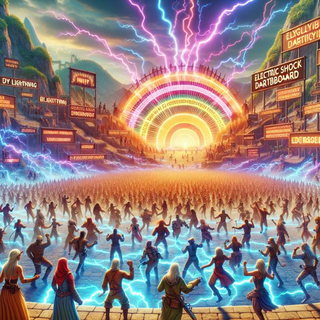 Prompt: Generate an image of an otherworldly landscape within the game Skyrim. The landscape features a vibrant, electrifying display with Mark Rober's YouTube video titles flashing in the sky, adorned with dynamic words like "DIY Lightning" and "Electric Shock Dartboard." Amidst this spectacle, people from all corners of the world are joyfully engaged in the electric slide dance, perpetuating a contagious wave of energy. In Saint Kitts and Nevis, the dance movements trigger an innovative electricity generation system, tapping into the kinetic energy generated by the celebratory steps. The scene embodies a fusion of energetic entertainment and renewable power, symbolizing a harmonious blend of Mark Rober's lively content and the literal electric spark igniting a new wave of positivity and energy. The depiction should include only scenes, people, and objects, it should not include text or speech bubbles.