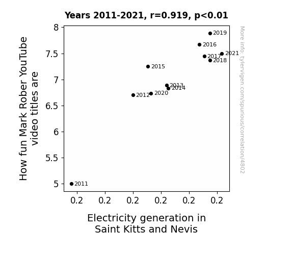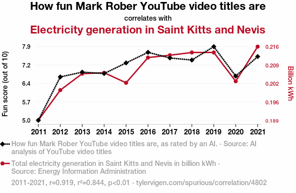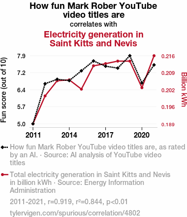 This means 84.4% of the change in the one variable (i.e., Electricity generation in Saint Kitts and Nevis) is predictable based on the change in the other (i.e., How fun Mark Rober YouTube video titles are) over the 11 years from 2011 through 2021.