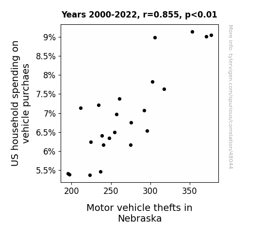 This means 73.1% of the change in the one variable (i.e., Motor vehicle thefts in Nebraska) is predictable based on the change in the other (i.e., US household spending on vehicle purchaes) over the 23 years from 2000 through 2022.
