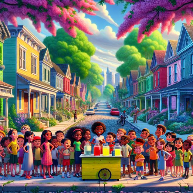 Prompt: Create an image that captures a neighborhood in Georgia with a whimsical, storybook charm. Picture a street lined with colorful houses and lush, blooming trees. In the foreground, imagine a group of children named Adonis standing proudly behind a lemonade stand, their faces beaming with determination and enthusiasm. As the children interact with their neighbors, portray the energy of the moment with vibrant colors and a sense of bustling activity. Show the spirited exchange between the Adonises and their Democrat-leaning neighbors, as the entire neighborhood comes alive with a palpable sense of excitement and motivation. The image should exude a magical quality, evoking the charm and charisma of a scene from a Disney movie, while also conveying the powerful message of civic engagement and community involvement. The depiction should include only scenes, people, and objects, it should not include text or speech bubbles.