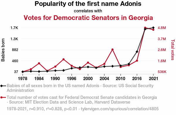 This means 82.8% of the change in the one variable (i.e., Votes for Democratic Senators in Georgia) is predictable based on the change in the other (i.e., Popularity of the first name Adonis) over the 17 years from 1978 through 2021.