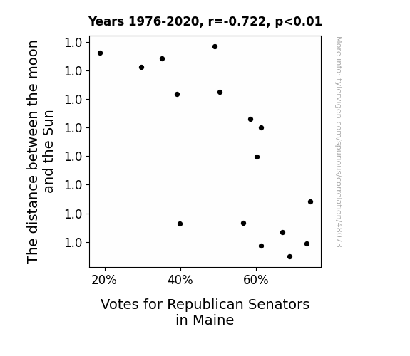 This means 52.1% of the change in the one variable (i.e., Votes for Republican Senators in Maine) is predictable based on the change in the other (i.e., The distance between the moon and the Sun) over the 16 years from 1976 through 2020.