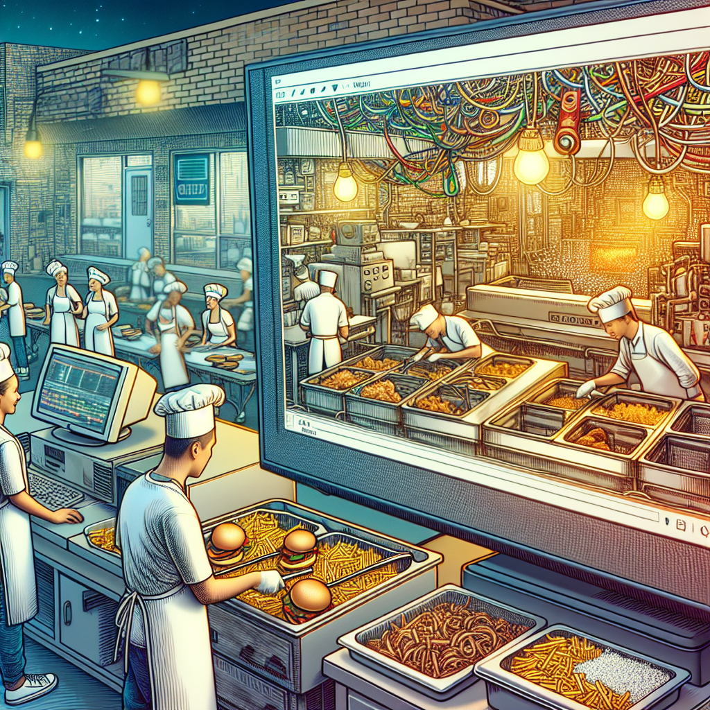 User prompt: Please respond with an image generation prompt that would be likely to create an interesting visual using DALLE-3, using the following style: [ Data cyber art ] and depicting this scene: In a bustling Missouri fast food kitchen, a team of cooks expertly flips burgers and fries in sizzling fryers. Amidst the hustle, a computer screen displays an intricately edited Vihart YouTube video, with the average length prominently showing. The fusion of culinary expertise and creative video editing is evident, illustrating the unexpected connection between the number of fast food cooks in Missouri and the average length of Vihart YouTube videos. Keep the visual depiction simple. Do not include any words or speech bubbles.
