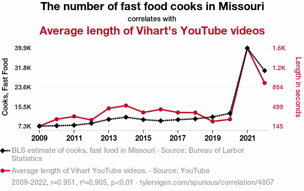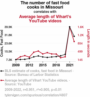 - The spurious research paper: The Tantalizing Ties between the Tally of Takeout Technicians in Missouri and the Length of Vihart Vlogging Videos