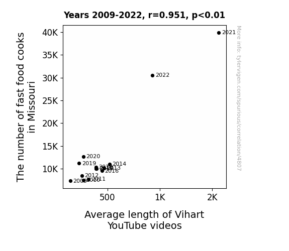 User prompt: Please provide potential search keywords for a paper titled The Tantalizing Ties between the Tally of Takeout Technicians in Missouri and the Length of Vihart Vlogging Videos with an abstract of This paper investigates the intriguing relationship between the number of fast food cooks in Missouri and the average duration of Vihart YouTube videos. Using data gathered from the Bureau of Labor Statistics and YouTube, we analyze the correlation between these seemingly incongruous variables. Our findings reveal a striking correlation coefficient of 0.9514034 with a statistically significant p-value of less than 0.01 for the period from 2009 to 2022. Our research sheds light on a whimsical linkage that transcends the culinary and digital realms. The implications of these results spark further contemplation of the underlying factors influencing both the fast food industry and online video production. This study opens the door to a multitude of puns and humorous observations, demonstrating the unexpectedly serendipitous interplay between the world of fast food and the captivating allure of Vihart's mathematical musings.