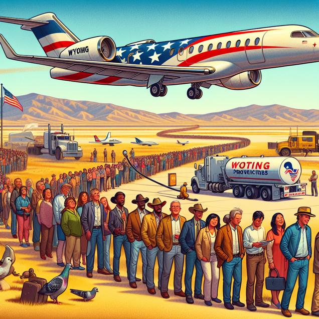 ChatGPT: Generate an image of a bustling Wyoming scene, with Republican voters lining up to cast their ballots. Above them, a high-tech private jet, adorned with the American flag, takes off. The jet's engines roar as it climbs higher into the sky. In the background, a tanker truck refuels a small plane on the tarmac in Niue, symbolizing the increased demand for jet fuel due to the ambitious political endeavors of Wyoming's Republican senators. Capture the scene's energy and the juxtaposition of political events alongside aviation infrastructure.