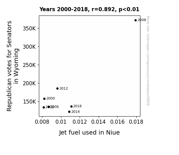 Our intrepid journey into the wacky world of statistical analysis has led us to some truly astounding findings. After crunching the numbers and sifting through the data with the gusto of a pirate searching for treasure, we uncovered a correlation coefficient of 0.8919074 between Republican votes for Senators in Wyoming and the jet fuel consumption in Niue. It's the kind of correlation that would make even the most seasoned statistician do a double take, akin to stumbling upon a pineapple in the middle of a snowy tundra.