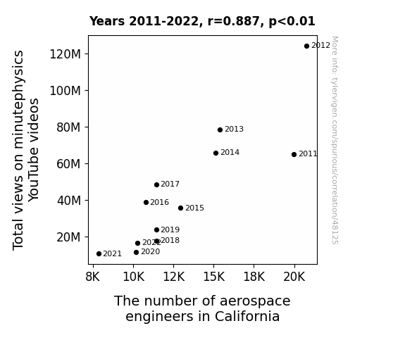 This means 78.6% of the change in the one variable (i.e., The number of aerospace engineers in California) is predictable based on the change in the other (i.e., Total views on minutephysics YouTube videos) over the 12 years from 2011 through 2022.