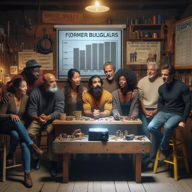 ChatGPT: [ A photo-realistic image ] Depict a cozy, rustic workshop in a quaint small town in Vermont. The former burglars are gathered around a wooden workbench, their attention captured by a projected screen displaying LockPickingLawyer's YouTube videos on lockpicking techniques. The warm glow of the projected light illuminates their faces and the workshop's surroundings. On the wall behind them, a chart showcases the decreasing rate of burglaries in the town, with visually appealing graphics that indicate the positive trend. Nearby, a proud sign boldly advertises their new locksmith business, adding a touch of entrepreneurial spirit to the scene. The atmosphere should convey a sense of camaraderie, determination, and transformation, as the group of former burglars wholeheartedly embraces their new venture.