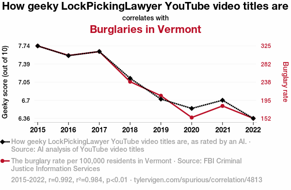 User prompt: Please make up a funny explanation for how a decrease in How geeky LockPickingLawyer YouTube video titles are caused Burglaries in Vermont to decrease.