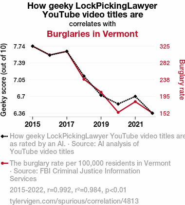 User prompt: Please provide potential search keywords for a paper titled Lock, Stock, and Two Smoking Barrels: The Jocular Relationship Between LockPickingLawyer YouTube Video Titles and Burglaries in Vermont with an abstract of In this study, we delve into the world of lock-picking, videos, and puns to investigate the potential connection between the content of LockPickingLawyer YouTube video titles and the occurrence of burglaries in the picturesque state of Vermont. Utilizing AI analysis of the intriguingly geeky video titles and data from the FBI Criminal Justice Information Services, we set out to unlock the mystery behind this unlikely association. Our findings revealed a remarkably high correlation coefficient of 0.9922000 and a significance level of p < 0.01 from the years 2015 to 2022.