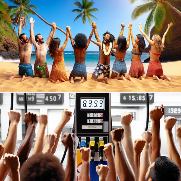 User prompt: Please describe a visual scene that prominently depicts both Votes for the Democrat Presidential candidate in Hawaii and Gasoline Prices in the US, in the following situation: As more people in Hawaii showed support for the Democratic candidate, the overall enthusiasm created a chain reaction of high-fives and fist bumps. This sudden surge in celebratory movements somehow disrupted the delicate balance of supply and demand in the gasoline market, leading to a nationwide increase in prices. Who knew that political excitement in a tropical paradise could fuel such a pump-tastic predicament for drivers across the country!. Keep the description simple.