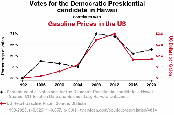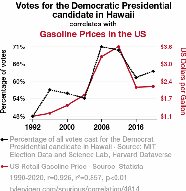 This means 85.7% of the change in the one variable (i.e., Gasoline Prices in the US) is predictable based on the change in the other (i.e., Votes for the Democratic Presidential candidate in Hawaii) over the 8 years from 1990 through 2020.