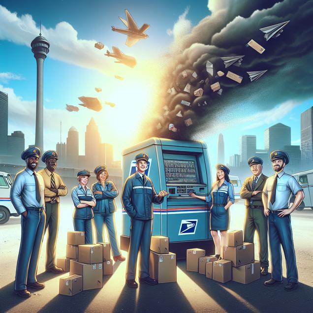 Prompt: Prompt: In a vibrant, sunny El Paso, a group of postal service machine operators are gathered around their surplus of machines, enjoying the bright blue skies and fresh air. The operators are depicted smiling and sharing laughter as they bask in the uplifting atmosphere. In the distance, a symbolic cloud of dust bunnies can be seen disappearing into the horizon, signifying the positive improvement in air quality. The overall scene should convey a sense of joy and optimism. The depiction should include only scenes, people, and objects, it should not include text or speech bubbles.