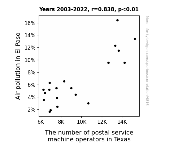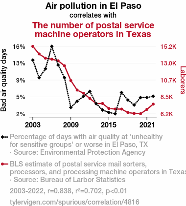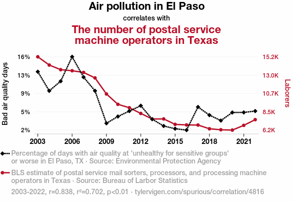 This means 70.2% of the change in the one variable (i.e., The number of postal service machine operators in Texas) is predictable based on the change in the other (i.e., Air pollution in El Paso) over the 20 years from 2003 through 2022.