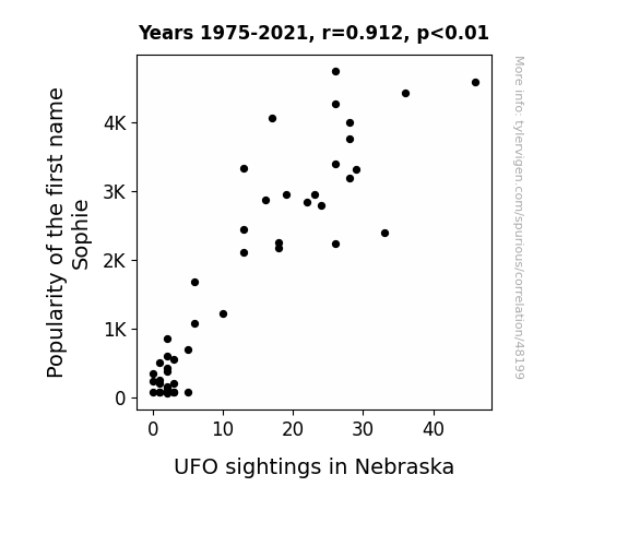 This means 83.2% of the change in the one variable (i.e., UFO sightings in Nebraska) is predictable based on the change in the other (i.e., Popularity of the first name Sophie) over the 47 years from 1975 through 2021.