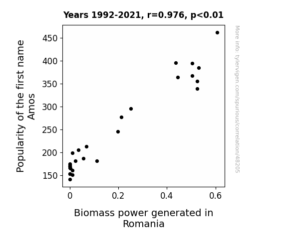 This means 95.2% of the change in the one variable (i.e., Biomass power generated in Romania) is predictable based on the change in the other (i.e., Popularity of the first name Amos) over the 30 years from 1992 through 2021.