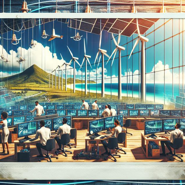 User prompt: Please describe a visual scene that prominently depicts both Renewable energy production in Barbados and Average length of Computerphile YouTube videos, in the following situation: As Renewable energy production in Barbados increased, it led to more efficient and reliable electricity supply. This, in turn, allowed the Computerphile team to power up their creative energy for longer periods, leading to the production of lengthier and more electrifying videos. In other words, as Barbados turned up the renewable power, Computerphile turned up the video length, creating a shocking connection between clean energy and extended screen time.. Keep the description simple.
