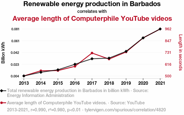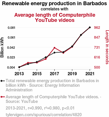 A linear line chart with years as the X-axis and two variables on the Y-axis. The first variable is Renewable energy production in Barbados and the second variable is Average length of Computerphile YouTube videos.  The chart goes from 2013 to 2021, and the two variables track closely in value over that time. Small Image