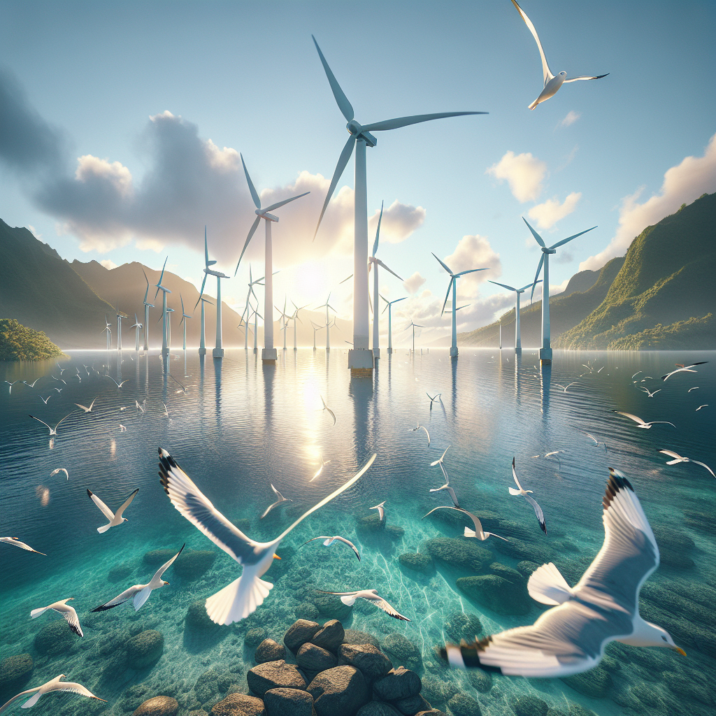 Prompt: [ A photo-realistic image ] A serene coastal landscape in French Polynesia, with crystal clear waters and an array of spinning hydroenergy turbines. Groups of majestic seagulls with outspread wings gracefully circle the turbines, adding an ethereal touch to the scene. In the distance, the soft glow of the sun casts a warm and inviting light over the entire setting. Meanwhile, the turbines’ motion, together with the seagulls’ effortless flights, harmoniously convey a sense of natural beauty and sustainable energy generation. The depiction should include only scenes, people, and objects, it should not include text or speech bubbles.