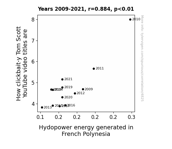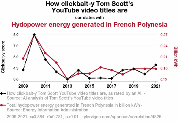 This means 78.1% of the change in the one variable (i.e., Hydopower energy generated in French Polynesia) is predictable based on the change in the other (i.e., How clickbait-y Tom Scott YouTube video titles are) over the 13 years from 2009 through 2021.