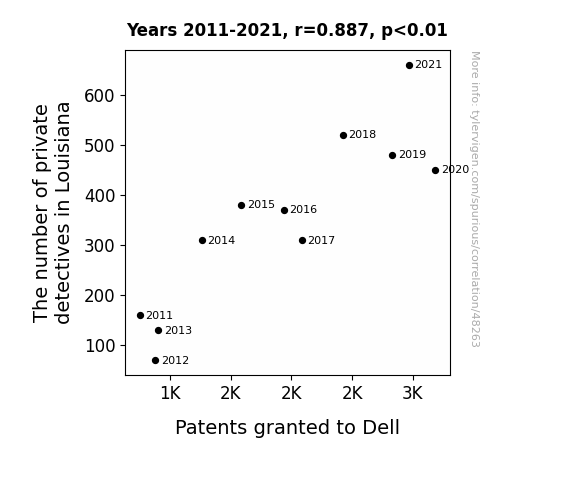 This means 78.6% of the change in the one variable (i.e., Patents granted to Dell) is predictable based on the change in the other (i.e., The number of private detectives in Louisiana) over the 11 years from 2011 through 2021.