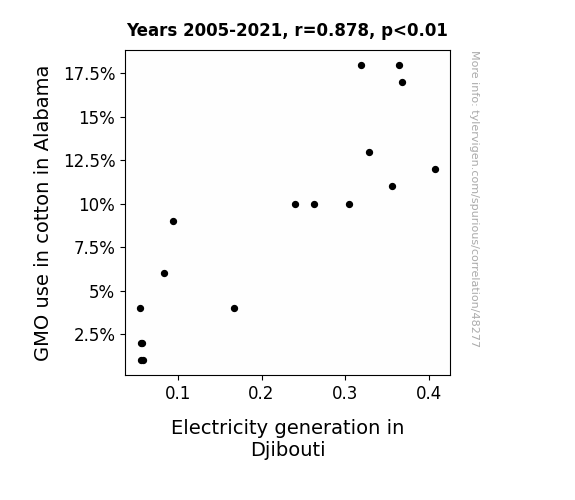 This means 77.1% of the change in the one variable (i.e., Electricity generation in Djibouti) is predictable based on the change in the other (i.e., GMO use in cotton in Alabama) over the 17 years from 2005 through 2021.
