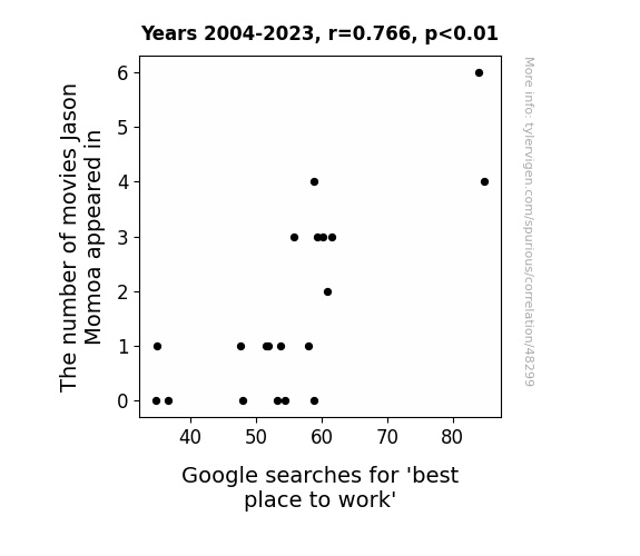 This means 58.7% of the change in the one variable (i.e., Google searches for 'best place to work') is predictable based on the change in the other (i.e., The number of movies Jason Momoa appeared in) over the 20 years from 2004 through 2023.