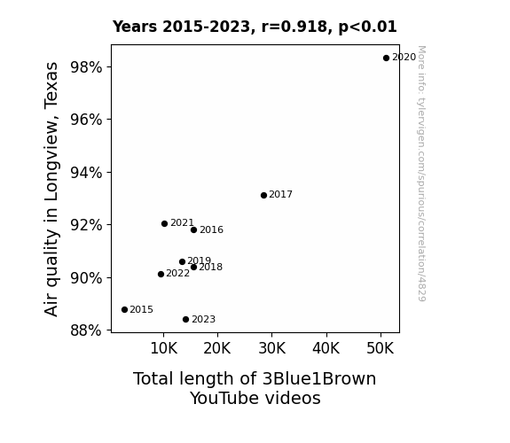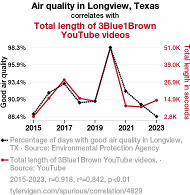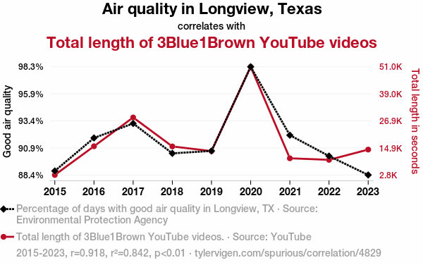 - The spurious research paper: Breathing in Math: Exploring the Link between Air Quality in Longview, Texas, and the Length of 3Blue1Brown YouTube Videos