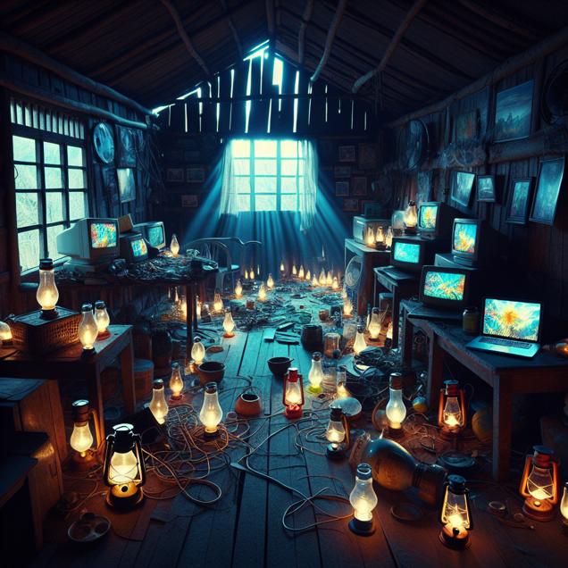 Prompt: Generate an image of a dimly lit room in a remote Filipino village, with scattered empty kerosene lamps lying by the wayside. The soft glow from the lamps has faded, leaving the space shrouded in darkness. Overhead, a computer screen flickers with the lackluster titles of CGP Grey's YouTube videos, void of the once bright and captivating phrases. The absence of kerosene has dimmed the creativity, casting a shadow on the previously shining video titles. The image should capture the somber and slightly humorous tone of the scene. The depiction should include only scenes, people, and objects, it should not include text or speech bubbles.