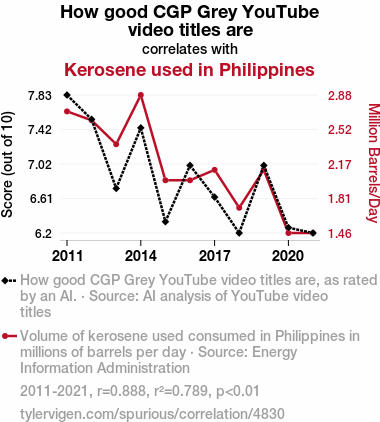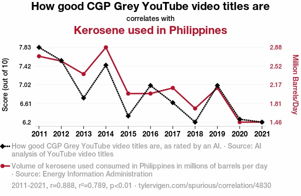 Our findings reveal a surprising correlation coefficient of 0.8883503 and p < 0.01 for the period spanning from 2011 to 2021. This correlation suggests a potentially strong relationship between the efficacy of CGP Grey's video titles and the consumption of kerosene in the Philippines. Further research is warranted to unravel the nuances of this unexpected connection.